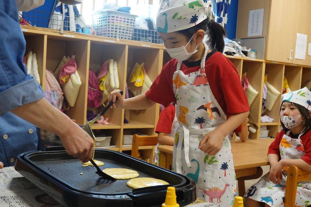 自分たちで生地をすくってホットプレートで焼いていきます😊